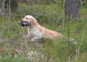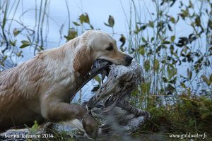Tehokkaan oloinen noutaja, joka suoriutuu päivän kaikista tehtävistä vaivattomasti. Koiran ja ohjaajan yhteistyö on hyvällä mallilla.